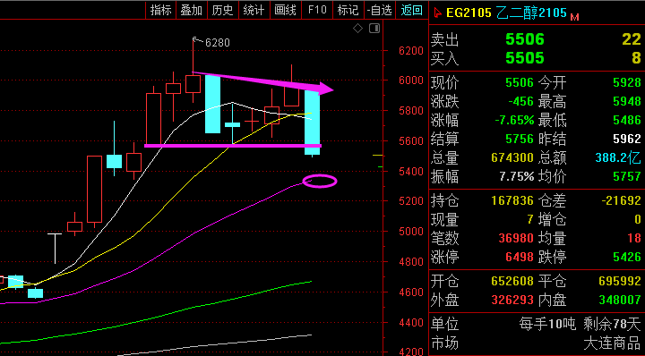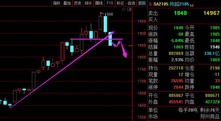 利剑无意:凌厉刚猛,无坚不摧,弱冠前以之与河朔群雄争锋。 软剑无常:三十岁前所用,误伤义士不祥,乃弃之深谷。 重剑无锋:大巧不工,四十岁前恃之横行天下。 木剑无滞:四十岁後,不滞於物,草木竹石均可为剑。 自此精修,渐进於无剑胜有剑之境。 愿以最简单的文字,作最精妙的行情分析。 纯碱2105—— 大周期日线图来看,昨天冲高回落留下长上影线,今天大阴线跌停,顶部呈看空形态; 小周期四小时来看,价格跌破近期的上升趋势线支撑,以及1875附近形成的支撑。 综合来看,纯碱暴跌之后承压于1875附近,有进一步回落的趋势。 乙二醇2105—— 大周期日线图顶部看空形态,连续两天调整线,整体仍偏向于继续回落