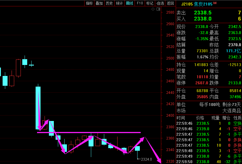 利剑无意:凌厉刚猛,无坚不摧,弱冠前以之与河朔群雄争锋。 软剑无常:三十岁前所用,误伤义士不祥,乃弃之深谷。 重剑无锋:大巧不工,四十岁前恃之横行天下。 木剑无滞:四十岁後,不滞於物,草木竹石均可为剑。 自此精修,渐进於无剑胜有剑之境。 愿以最简单的文字,作最精妙的行情分析。 焦炭2105—— 大周期周线图来看,昨天分析依托2365-75区域阻力将看向61.8%回撤位置2275附近,今天价格最高2383一线,最低2306一线,虽然反弹部分,但整体还是偏空; 小周期小时图来看,第一根K线冲高回落,第二根K线收中阴线,都受阻于2352一线,下午两根K线反弹,都没有突破2352附近阻力,短线或将自