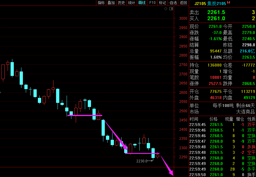利剑无意:凌厉刚猛,无坚不摧,弱冠前以之与河朔群雄争锋。 软剑无常:三十岁前所用,误伤义士不祥,乃弃之深谷。 重剑无锋:大巧不工,四十岁前恃之横行天下。 木剑无滞:四十岁後,不滞於物,草木竹石均可为剑。 自此精修,渐进於无剑胜有剑之境。 愿以最简单的文字,作最精妙的行情分析。 焦炭2105—— 大周期周线图来看,两连阴大幅回落,走势偏空,回顾之前一波涨势,自去年9月底从1805附近拉升到3036一线,这波升势的50%位置在2420附近,61.8%位置在2275附近,短线将到2275附近才有可能止跌; 小周期来看,价格低开暴跌2373.5一线,跌破此处支撑后,反弹也一直受阻于2365-70区域