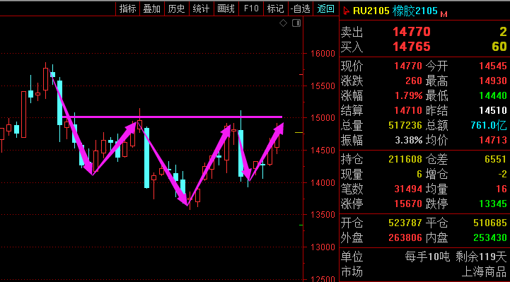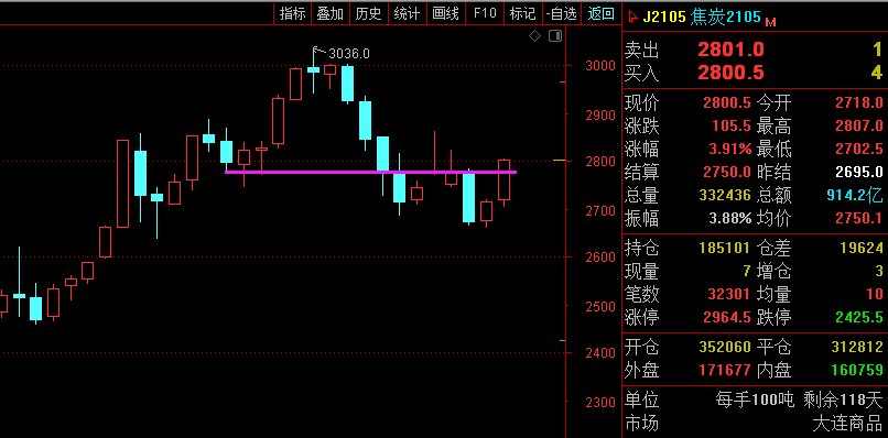 利剑无意:凌厉刚猛,无坚不摧,弱冠前以之与河朔群雄争锋。 软剑无常:三十岁前所用,误伤义士不祥,乃弃之深谷。 重剑无锋:大巧不工,四十岁前恃之横行天下。 木剑无滞:四十岁後,不滞於物,草木竹石均可为剑。 自此精修,渐进於无剑胜有剑之境。 愿以最简单的文字,作最精妙的行情分析。 焦炭2105—— 大周期日线图来看,前六根K线收盘价都受阻于2780一线,今天大幅拉升,不仅站稳2780一线,而且还站上2800关口,有继续反弹的趋势; 小周期昨天分析依托2690-2700区域看反弹,最低2703一线,目前四小时图也是突破最后一根均线在2780附近形成的阻力,有望上升至2850-60区域。 综合来看,