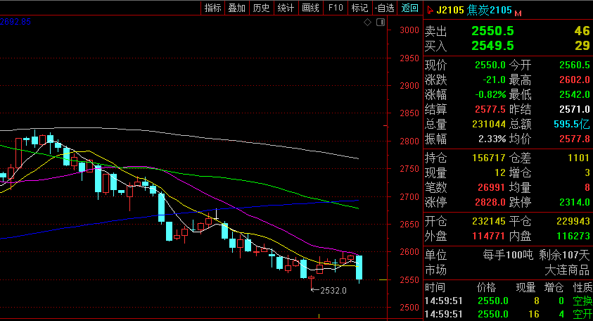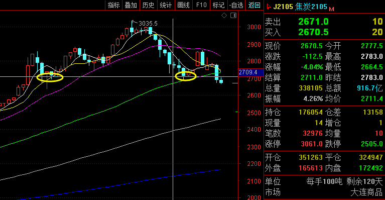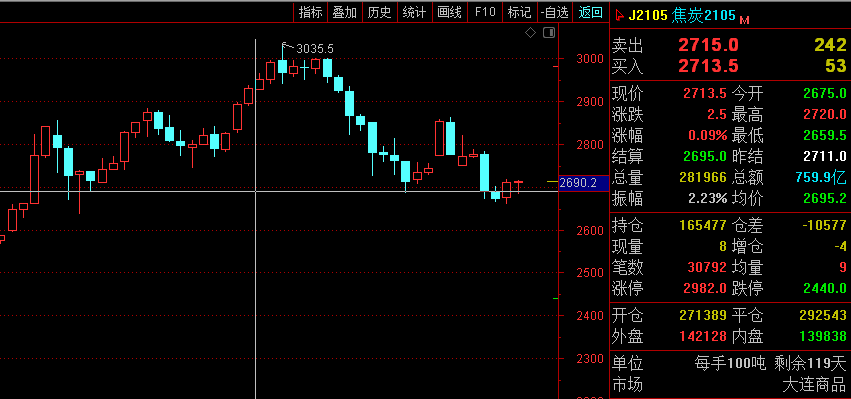 利剑无意:凌厉刚猛,无坚不摧,弱冠前以之与河朔群雄争锋。 软剑无常:三十岁前所用,误伤义士不祥,乃弃之深谷。 重剑无锋:大巧不工,四十岁前恃之横行天下。 木剑无滞:四十岁後,不滞於物,草木竹石均可为剑。 自此精修,渐进於无剑胜有剑之境。 愿以最简单的文字,作最精妙的行情分析。 焦炭2105—— 大周期日线图来看,上周五于60均线附近止跌,但今天没有企稳反弹,反而是小幅跌破,有进一步走低的趋势; 小周期小时图反弹承压于20均线回落,一根大阴线抹平今天所有的涨幅,可见空头还是强势。 综合来看,焦炭依托2570-80区域阻力,有进一步回落的趋势。 焦煤2105—— 大周期日线图来看,焦煤上周五就已