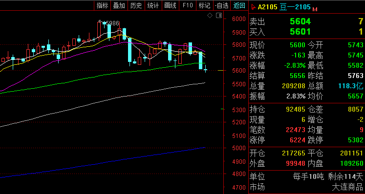 利剑无意:凌厉刚猛,无坚不摧,弱冠前以之与河朔群雄争锋。 软剑无常:三十岁前所用,误伤义士不祥,乃弃之深谷。 重剑无锋:大巧不工,四十岁前恃之横行天下。 木剑无滞:四十岁後,不滞於物,草木竹石均可为剑。 自此精修,渐进於无剑胜有剑之境。 愿以最简单的文字,作最精妙的行情分析。 豆一2105—— 大周期日线图来看,1月14暴跌收盘在5655一线之后,连续6根K线都收盘都没有低于5655一线,今天收盘于5600一线,价格与收盘价都是新低,说明空头动能放量,有进一步走低的趋势; 小周期四小时图来看,1月14价格暴跌之后,价格主要集中在5650-5830区域内运行,同时下方辅以60均线支撑,目前价格
