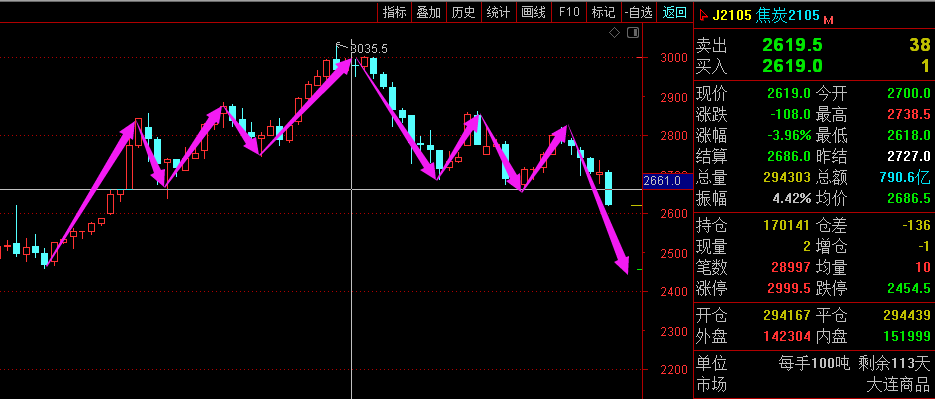 利剑无意:凌厉刚猛,无坚不摧,弱冠前以之与河朔群雄争锋。 软剑无常:三十岁前所用,误伤义士不祥,乃弃之深谷。 重剑无锋:大巧不工,四十岁前恃之横行天下。 木剑无滞:四十岁後,不滞於物,草木竹石均可为剑。 自此精修,渐进於无剑胜有剑之境。 愿以最简单的文字,作最精妙的行情分析。 焦炭2105—— 大周期周线图来看,自顶部收看跌吞没之后,价格开始回落,上周是调整的一周,本周进一步走低,如果收盘没有大的反弹的话,短期至少还有100-200个点下行空间; 小周期来看,焦炭呈对称式走法,跌破2660附近颈线支撑,有进一步回落的趋势。 综合来看,焦炭短线承压于2650-60区域,将继续回落。 焦煤210