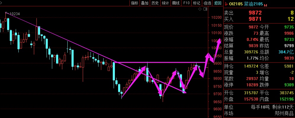 利剑无意:凌厉刚猛,无坚不摧,弱冠前以之与河朔群雄争锋。 软剑无常:三十岁前所用,误伤义士不祥,乃弃之深谷。 重剑无锋:大巧不工,四十岁前恃之横行天下。 木剑无滞:四十岁後,不滞於物,草木竹石均可为剑。 自此精修,渐进於无剑胜有剑之境。 愿以最简单的文字,作最精妙的行情分析。 焦炭2105—— 大周期日线图来看,整体多头趋势,在价格大幅回落之后,连续两天在一个相对高的位置收倒锤头阳线,短线比较抗跌; 小周期小时图来看,低开在2750一线,然后迅速拉升企稳20均线支撑,之后就一直没跌破20均线支撑,说明下方支撑较强,偏向于反弹,上方一旦突破60均线在2860附近阻力,将迎来一波大的上涨。 综合