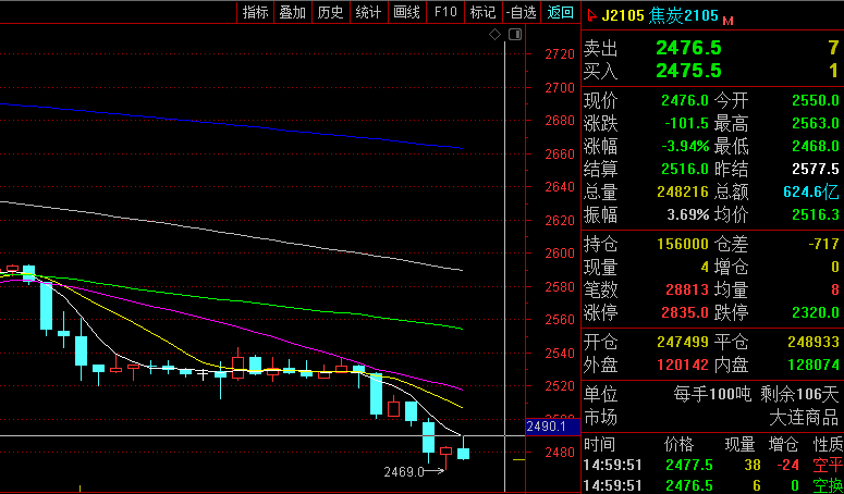 利剑无意:凌厉刚猛,无坚不摧,弱冠前以之与河朔群雄争锋。 软剑无常:三十岁前所用,误伤义士不祥,乃弃之深谷。 重剑无锋:大巧不工,四十岁前恃之横行天下。 木剑无滞:四十岁後,不滞於物,草木竹石均可为剑。 自此精修,渐进於无剑胜有剑之境。 愿以最简单的文字,作最精妙的行情分析。 焦炭2105—— 大周期日线图这两天主要围绕60均线运行,上周五没有跌破,本周一小幅跌破,今天承压于此大幅回落,那么后续就有进一步走低的趋势; 小周期来看,最初一直运行在2520支撑上方,下午开盘后直接就跌破2520短线支撑,更进一步跌破2500整数关口,目前初步阻力位于2490附近。 综合来看,焦炭短线依托2485-