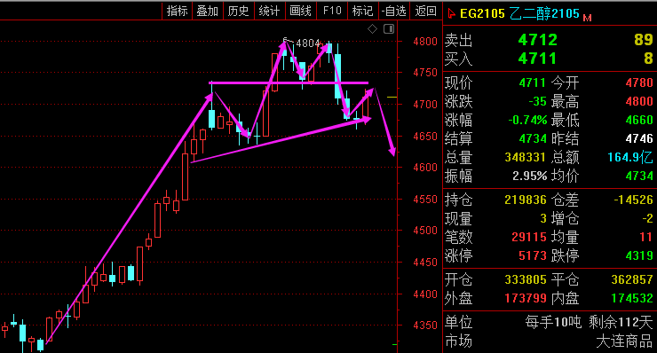 利剑无意:凌厉刚猛,无坚不摧,弱冠前以之与河朔群雄争锋。 软剑无常:三十岁前所用,误伤义士不祥,乃弃之深谷。 重剑无锋:大巧不工,四十岁前恃之横行天下。 木剑无滞:四十岁後,不滞於物,草木竹石均可为剑。 自此精修,渐进於无剑胜有剑之境。 愿以最简单的文字,作最精妙的行情分析。 焦炭2105—— 大周期日线图来看,昨天中阴线回落,今天冲高回落,带长上影线,暂时未有见底信号; 小周期来看,此前暴跌在2535附近短暂止跌,然后以此阻力进一步走低,今天价格反弹也是自此承压回落。 综合来看,焦炭短线承压于2535附近,走势依然偏空,但在跌破2455-60区域之前,不可过分看空。 乙二醇2105—— 大