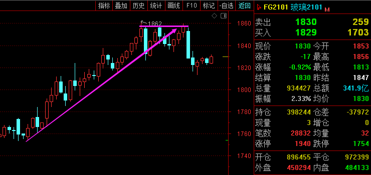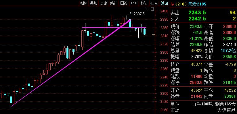 利剑无意:凌厉刚猛,无坚不摧,弱冠前以之与河朔群雄争锋。 软剑无常:三十岁前所用,误伤义士不祥,乃弃之深谷。 重剑无锋:大巧不工,四十岁前恃之横行天下。 木剑无滞:四十岁後,不滞於物,草木竹石均可为剑。 自此精修,渐进於无剑胜有剑之境。 愿以最简单的文字,作最精妙的行情分析。 焦炭2105—— 大周期日线图顶部一根阴线吞没之前两根阳线,长线是否见顶不一定,但短线无疑将继续回落; 小周期价格跌破上升趋势线和2360支撑,以及小时图20均线支撑,短线偏空。 综合来看,焦炭昨天虽然新高了,但目前价格大幅回落,短线承压2350-60区域偏空走势,下方支撑2300一线。 甲醇2101—— 大周期日线图