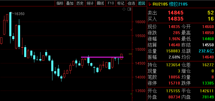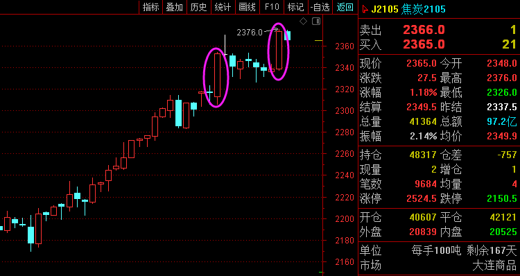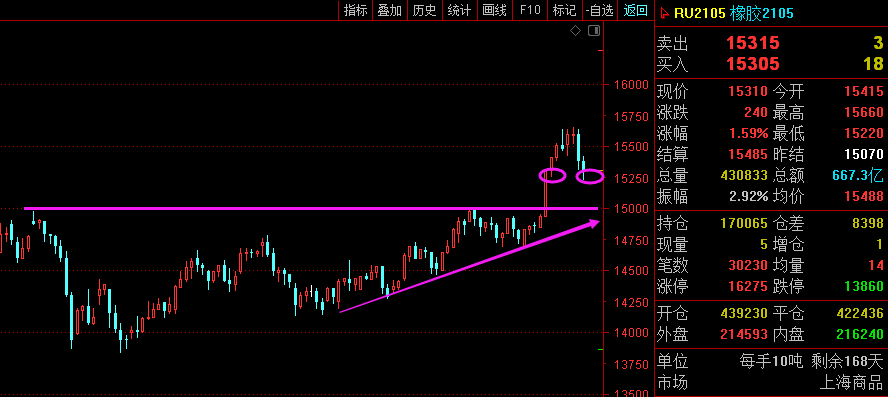 利剑无意:凌厉刚猛,无坚不摧,弱冠前以之与河朔群雄争锋。 软剑无常:三十岁前所用,误伤义士不祥,乃弃之深谷。 重剑无锋:大巧不工,四十岁前恃之横行天下。 木剑无滞:四十岁後,不滞於物,草木竹石均可为剑。 自此精修,渐进於无剑胜有剑之境。 愿以最简单的文字,作最精妙的行情分析。 焦炭2105—— 大周期日线图7连阳拉升,强势多头; 小周期昨天依托2355-60区域看涨,最低刚好2360一线,最高已到2390一线,价格已经在2360上方企稳,并且初步支撑上移至2375一线。 综合来看,焦炭依托2360-75区域支撑,有望新高。 橡胶2105—— 大周期周线来看,暴涨之后回调,现在已由回调再次转为