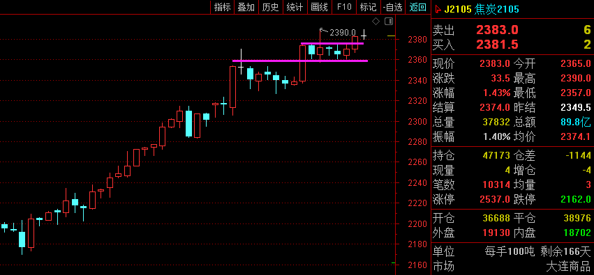 利剑无意:凌厉刚猛,无坚不摧,弱冠前以之与河朔群雄争锋。 软剑无常:三十岁前所用,误伤义士不祥,乃弃之深谷。 重剑无锋:大巧不工,四十岁前恃之横行天下。 木剑无滞:四十岁後,不滞於物,草木竹石均可为剑。 自此精修,渐进於无剑胜有剑之境。 愿以最简单的文字,作最精妙的行情分析。 焦炭2105—— 大周期日线图六连阳拉升,MACD多头动能放量,强势多头; 小周期昨天依托2330支撑看涨,最低2326一线,最高2376一线,小时图大阳线之后小幅调整继续涨,目前亦是如此,支撑2355-60区域。 综合来看,焦炭依托2355-60区域支撑有望进一步走高。 苯乙烯2101—— 大周期周线图多头趋势,目前