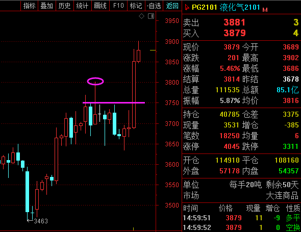 利剑无意:凌厉刚猛,无坚不摧,弱冠前以之与河朔群雄争锋。 软剑无常:三十岁前所用,误伤义士不祥,乃弃之深谷。 重剑无锋:大巧不工,四十岁前恃之横行天下。 木剑无滞:四十岁後,不滞於物,草木竹石均可为剑。 自此精修,渐进於无剑胜有剑之境。 愿以最简单的文字,作最精妙的行情分析。 铁矿2105—— 大周期四小时加速上升,MACD多头动能放量中,RSI运行到80上方,目前涨势良好; 小周期来看,今天价格跳空低开之后,反弹一直受阻于906附近阻力,尾盘拉升突破。 综合来看,铁矿短线支撑906附近,有望继续上升。 LPG2101—— 大周期日线图大阳线拉升,突显多头强势,但上方面临3930-50强压;