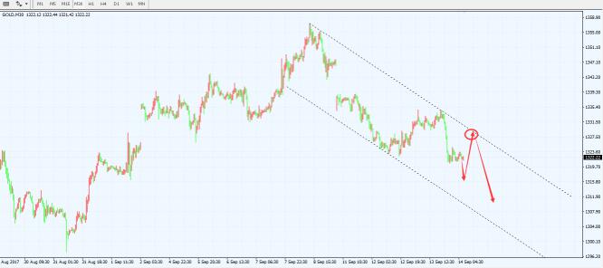 朝鲜没有进一步的举动,美国周初申请失业金人数的意外增加,也只是因为飓风的影响。所以利多黄金的两重因素消退,黄金从高位回落,今日早间跳空低开,最底触及1334.49,目前有转势的可能,另外接下来就是需要关注美联储缩表了。把握做空的机会。 狙击战法系统一:4小时上升通道,下轨的支撑在1300附近,所以暂时先不考虑。1