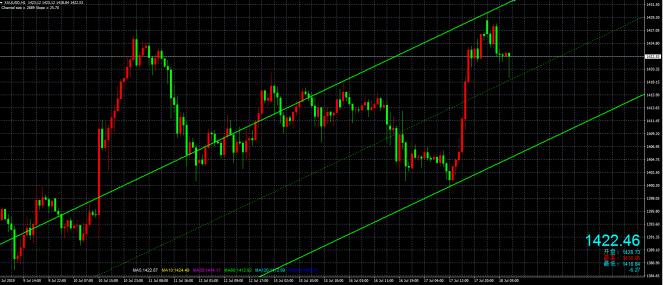 我不认为我是个善人,但当你们亏得一塌糊涂之时,我竟有些不忍看下去,当你们亏损之后找到裕鑫金之时,我心里想的是该如何去帮助你们,无事不登三宝殿,你们找到我必然多多少少是因为有问题需要解决的,茫茫人海相遇,道不尽的缘分,人生在世不如意,世人且知舍与得。我是裕鑫金,你值得信赖的黄金分析师。 周一黄金主要是进行修正,上周五的强势下跌,必须要经历一个修正过程,昨日黄金以时间换空间的修正手法出现,整日形成5-7美金的区间震荡。盘中最高1429.7,最低1422.1,收盘以一根小十字阴线报收于1424.6.基本符合预期。对于昨天的走势来看,价格早盘以1422做为依拖,冲击周五晚间的二次下跌点1430一线后