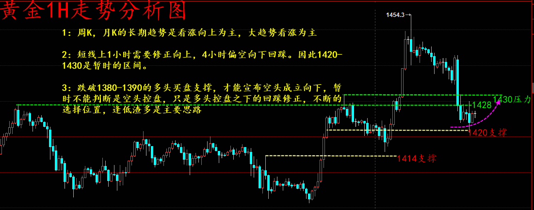 人生坎坷很正常,先要树立理想,为了目标勇奋斗,再苦再难也无妨。只要坚定自信心,梦想在心永不离,任何困难有何难?顽强意志将它摧! 早盘黄金开盘1428一线,但是随后快速回落,走势依旧偏弱,上周五4小时的十字中继修正信号,暂时还没有得到回应,日内如果4小时持续以连阴信号出现,那么黄金破位中轨震荡下行回踩1400的支撑概率加大!日内我们需要做好这几件事情。 第一:日内先行关注1小时的反弹修正情况,目前1小时随机指标超卖区间运行,有一定的修正信号,如果需要持续的下破走势,那么1小时的随机指标必定需要重新上涨修正,因此日内先关注1小时的指标如何修正。压力位置1430一线,其次1435和1440两个位置