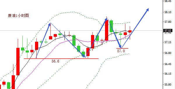 黄金走势: 周五亚市盘初现货黄金短线拉升24美金,最高触及1411.8美元,随后黄金震荡回落,最低下探至1382一线,回吐了日内所有涨幅,4小时图上高位连收两根阴线,虽然今日再次突破新高,但因为昨日冲高回辙没有到位,多头动能上出现了衰退,导致了今日的冲高回落,目前黄金企稳1382震荡反弹,上方1400将成为晚间的重要阻力区,今日周五周线收官,预计晚间再难有动力去破高,走震荡的概率大,操作上建议在1400区域尝试去做空看调整。 操作建议:建议1400附近空,止损1406,目标1390-1387; 原油走势: 原油昨日在56.6获得支撑继续走高,今日早盘回落欧盘再次在56.6支撑上涨,日内最高触