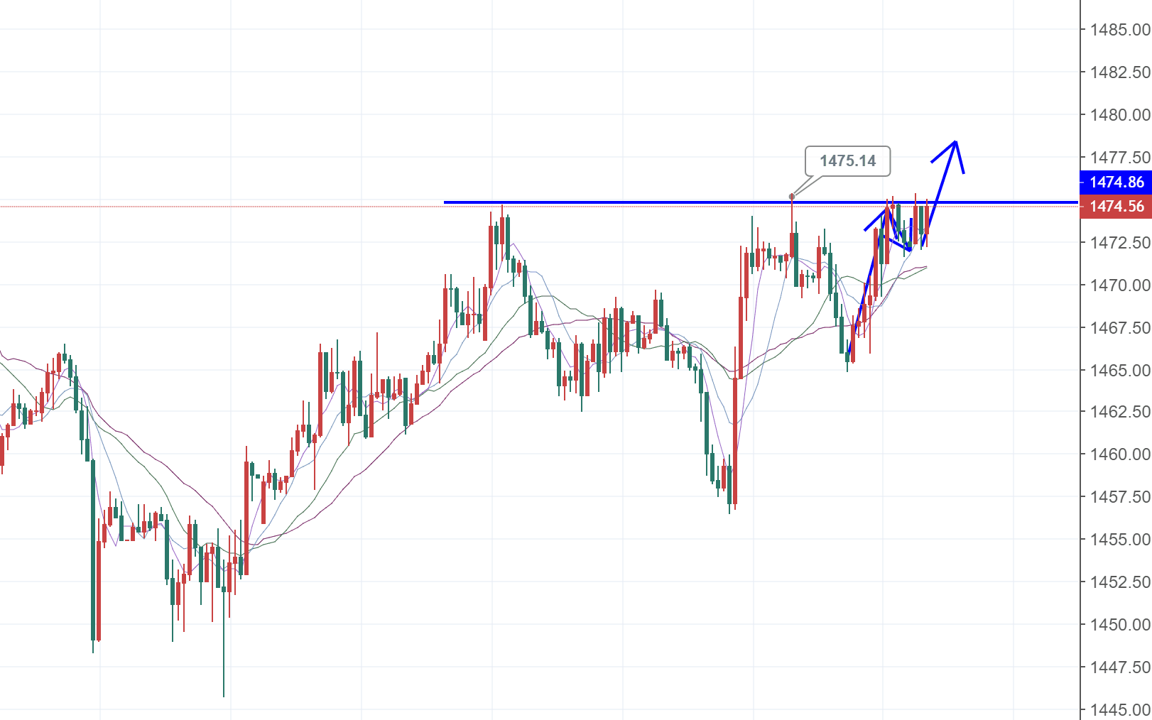 黄金行情分析 上周黄金整体属于一个震荡的冲高回落,一直在1462-1478这个区间来回震荡,我们也多次在这个区间来回操作,布局过1466多单,也布局过1469多单,然后在1474附近出,在1474附近又开始反手布局了空单,上周尾盘又在1470布局空单,全部在1463出,震荡行情就需要来回区间操作,找出震荡的区间最重要,不过这样的来回震荡在本周即将结束,周线收小阴线,上影线较长,预示着黄金空头即将发力,空头将会向下震荡,现在黄金是属于大跌后的一个底部震荡修复,上周出现反弹疲软信号,本周空头即将重新在下方寻找更强支撑,我们操作以反弹做空为主。 1H的K线形态形成了弧形形态,预示着上周反弹的高点1