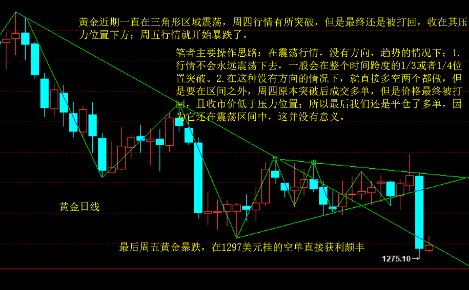 陆良策:6.18周一黄金下跌24美金,后市价格何去何从? 上周黄金犹如瀑布一般暴跌24美金之多,黄金打破震荡格局,周五日内行情跌至1275美元;这波行情不知道有多少投资者拿到利润,笔者获利颇丰,12手陆续建仓的空头头寸,让我获利非常可观。 上周黄金为何突破暴跌,投资者如何能抓住蛛丝马迹? 笔者在最近的文章中一直讲的比较清楚了,黄金上周整体处于三角形区域震荡;向上,向下都有可能突破,周四黄金向上突破,我当时表示,黄金日内向上突破,当然没有问题,但是问题是,日内突破究竟算不算有效突破,我当时给的建议是,可以短线做多,获利之后就可以出来,因为日内黄金突破上档阻力位置之后,我们还要继续看到
