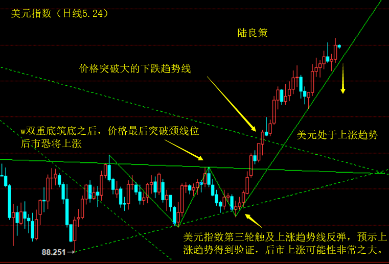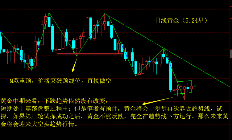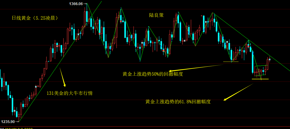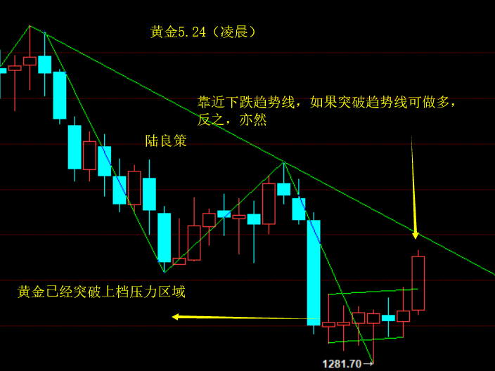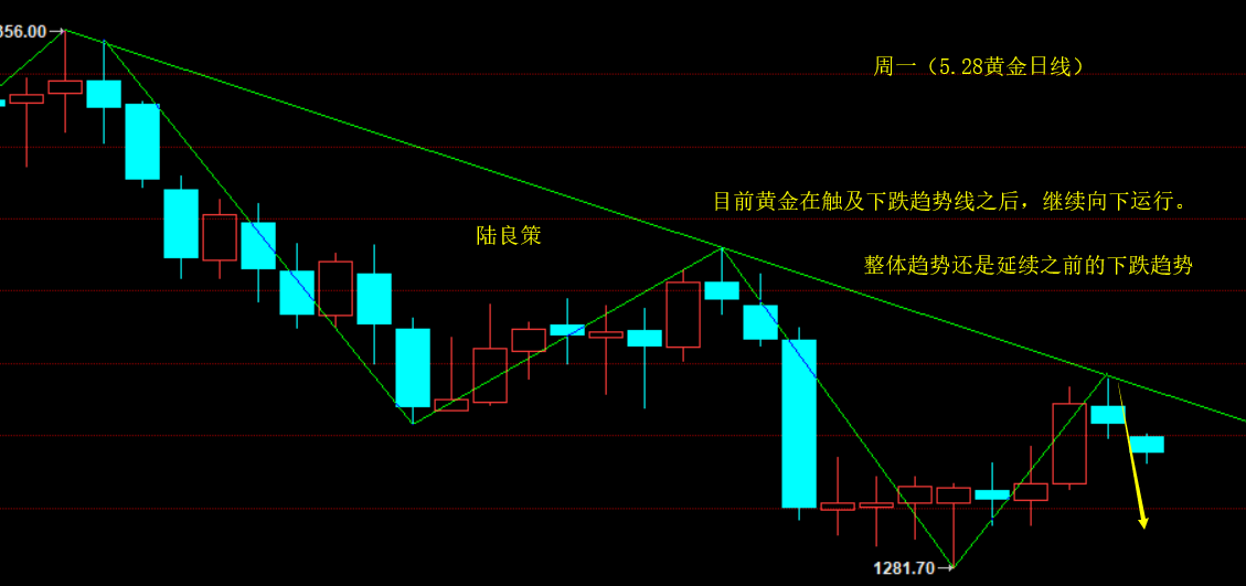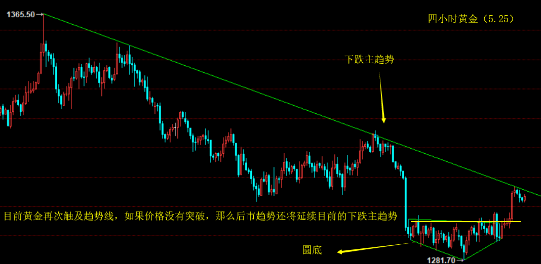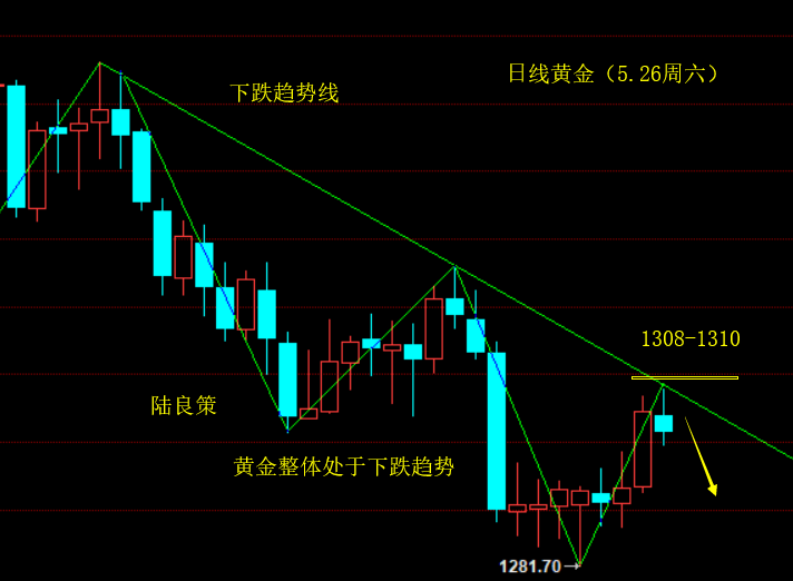 摘要: 近期黄金走出一轮多头行情, 金价在触及1281.70美元的历史低点后,转头向上反弹上扬,截至目前黄金已经向上反弹20美金。 日线上黄金最后收于1301美元/盎司。 黄金本轮反弹,也将是第三次触及下跌趋势线;这是从4月18到5月11日画出的一条下跌趋势线;所以说,我说黄金目前来到了十字路口;事实上目前黄金反弹至1301美