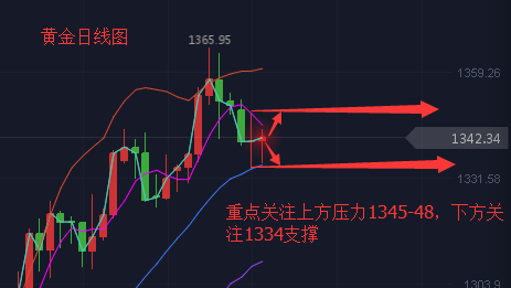 昨日黄金整体上走出了一波过山车的行情,早盘自1342一线下跌到达了1334附近,随后拉升到1349附近,后半夜回落到1335附近,虽然没有破位出现新低,但行情整体上再一次回归到了空头,还记得我说过的,冲高回落有望加速见顶,行情拉高再砸下来,那么肯定会延续走跌的,对于日内的思路,我们也是看空的,这一点毫无疑问,只是选