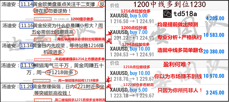 汤迪安:11.25黄金中线多空55点利润布局公开验证,下周该如何操作? 论黄金市场谁主沉浮?笔者黄金投资野林第一高手——汤迪安自不敢当!说顺测黄金运行之道,精准伏击波段顶底利润,迪安绝对有那个实力!投资这个事业迪安不怕失败,也从不纠结于做错了方向,因为我有72种方式利用后期行情快速实现扭亏并不断盈利,一路翻仓!有操作不如意的可以通过微言搜.//td518a即可找到我。 》》迪安团队近期中线多空55点利润是如何把握的?事实为证,翻仓其实不难! ====迪安团近期队中线空思路布局,千二关口附近提示空单告一段落,获利25美金出局!可结合后文中的“中线多思路” 很多人觉得投资翻仓很难,想都不敢想,可