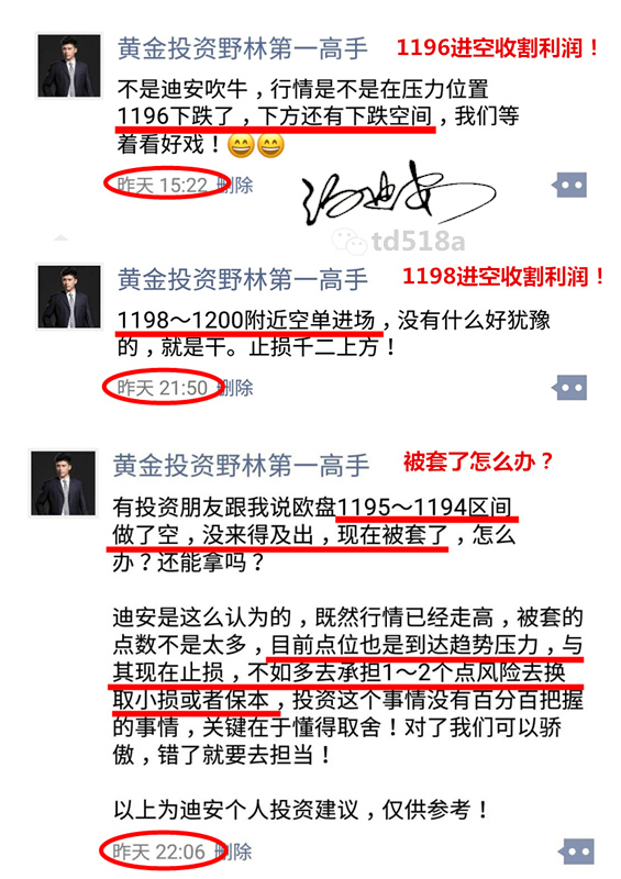 汤迪安:9.7黄金本周盈利停不下来,非农翻仓给你看! 》》周三黄金操作回顾:短中线共计获利17美金 短线操作方面:亚盘1191-1195多单,首次触及1195的时候布局1195-1193空单(下跌不及预期),美盘首次触及1198朋友圈提示1198-1220附近直接空,晚间最低到达1195。多空获利9美金。 中线操作方面:欧盘行情拉涨1196附近出现急速回落,我们布局1192-1198多单。多单获利8美金。 短中线共获利17美金,开仓1手操作,就是获利1700美金,10手操作就是17000美金,20手操作就是340000美金,操作的好不好,要看你们有没有跟上迪安的步伐实现投资真正盈利和翻仓!有