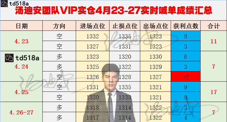 汤迪安:4.24黄金站不稳1326,美盘谨防再度回撤! 周初迪安坚定做空黄金完全正确,周一日内行情跟迪安预期一致,亚盘关注行情反弹的力度,欧盘遇阻1335一线连续承压回落后,最终跌批1330支撑,盘中空头趋势就非常明显,此时笔者果断在1332现价顺势跟空,此单完美到达1323一线止赢获利9美金。 在日线大阴强压下,此时不