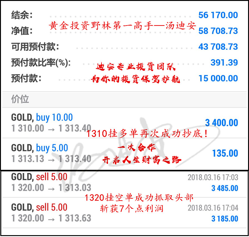 汤迪安:3.17黄金从1320暴跌10个点,我们从头吃到尾 没有总是一直处于亏损状态的投资,只有不成熟的投资交易系统! 我便是充满异常自信,纵横黄金投资市场多年的野林第一高手汤迪安,在这个充满魅力与诱惑的投资市场中,我汤迪安称第二,没人敢在我面前称自己是第一! 真诚祝愿下一个投资金友能成功超越现在的迪安(唯/td518