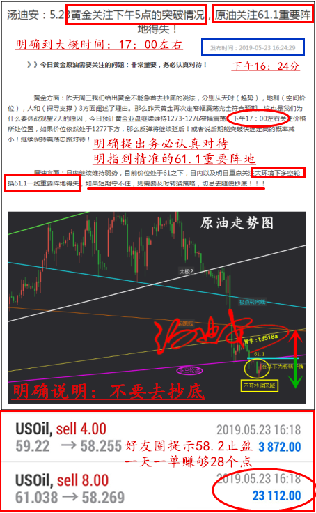 汤迪安:5.24周四原油再次成功抓顶61.1,黄金明确到具体时间引发大涨! ==============此篇文章的主旨:位置决定性质——周四原油所处的特殊位置,引发大跌后的再次单日暴跌38个点;时机决定进攻成败,黄金容易打破震荡的时间节点 人生自古谁无死,留取丹心照汗青!人总要努力去做对社会有意义的事,投资想要轻松赚盈利,就找汤迪安老师!!! 迪安团队“ 科学投资盈利密训 ”计划,今天已经进行到第五天,盈利计划进行的非常顺利。【每天策略提前公布,全网及好友圈可具体查询!】 (周一市场捷报):周一原油精准抄底在当天最低位置62.4;黄金抄底在当天最低位置1273,共计20个点。 (周二市场捷报