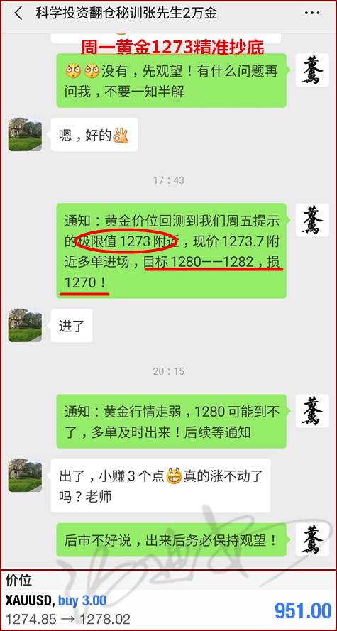 汤迪安:5.21黄金1273精准抄底大赚,科学投资助轻松获利! =================================== 人生自古谁无死,留取丹心照汗青!人总要努力去做对社会有意义的事,投资想要轻松赚盈利,就找汤迪安老师!!! “周一日间市场我们给出的策略参考”,如下: 周一日间黄金市场捷报: 黄金:午间迪安已经提示先观望为主,让实仓朋友务必保持同一节奏!午后朋友圈提示防止行情走1273-1282宽幅整理,午后行情如期下跌到位,黄金多单进场,轻松获利走人! 原油,直接破位我们提示63.4-63.1区域,随后多次反弹在63.1位置遇阻,也说明我们对点位的把握非常精准,没有进场机会