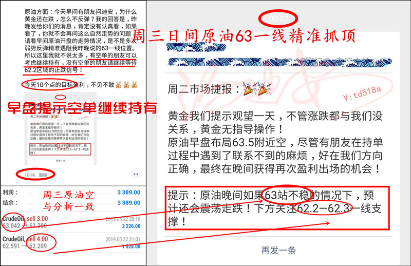 汤迪安:5.23本周3天交易独揽原油42个点,我也想低调但实力不允许呀! =================================== 人生自古谁无死,留取丹心照汗青!人总要努力去做对社会有意义的事,投资想要轻松赚盈利,就找汤迪安老师!!! (周一市场捷报):周一黄金,原油精准抄低在当天最低位置。黄金1273多,获利4个点,原油62.4多!区间操作获利16点! 策略刚发出去,黄金就触62.4上涨,并且午夜围绕62.4-63.2如期走区间震荡!高空低多思路正确! (周二市场捷报):周二黄金休战,原油抓次高位置63.6空!获利6个点! 周二,黄金选择观望一天,并严格执行!原油当天90%