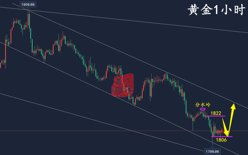 早上醒来习惯性的打开手机看行情,才突然想起今天是周末。本来想好好睡个懒觉,还是早早的醒了,不知道是人老觉变少了,还是习惯如此,曾几何时还能一觉睡到中午。现在每天都在和时间赛跑,希望能抓住每一波行情,尽善尽美可以做的更好,然而现实总有错过机会的时候,或许遗憾就是这个市场最大的魅力,永远对下一单心怀希望!——万锦晟 黄金方面 上周黄金极弱下跌,周尾在美储主席鲍威尔讲话后加速大跌,接连击穿日线图上支撑线,价格触底1800关口,周五低位收盘,日线再度大阴。虽然整体节奏主空偏弱,但是当前黄金走到这个位置,要防止出现较大幅度反弹,指标上初现底背离信号,价格也触及通道下轨支撑,在没有下破1800之前谨慎追