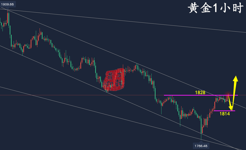 看过这样一句话,十年前你是谁,一年前你是谁,甚至昨天你是谁,都不重要。重要的是,今天你是谁?就算昨天的你失意落寞,但只要今天的你在认认真真地努力,未来的你就不会重蹈覆辙;就算昨天的你懒惰迷茫,但只要今天的你在勤勤恳恳地奋斗,未来的你就不会一败涂地!——万锦晟 黄金方面 黄金昨日围绕1820—1807区间运行,凌晨冲高回落触及1825一线,日线阳十字K。整体来看黄金趋势还是空,目前止跌横盘走修正,看续跌空还是看反弹多?美指日线三连阴,短线有进一步回落的可能,但趋势还是强势多,当前的回调只是多头修正,美指强支撑102.3一线。 黄金低位横盘,企稳小时线通道上轨之上,依托30日均线支撑震荡上行,大