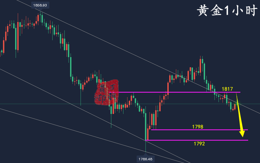 每天都在和时间赛跑,希望能抓住每一波行情,尽善尽美可以做的更好,然而现实总有错过机会的时候,或许遗憾就是这个市场最大的魅力,永远对下一单心怀希望!——万锦晟 晚间黄金 日内黄金承压1818一线压力,早间小幅反弹后,欧盘直接直接转跌,大阴弱势破低,下破1800关口,最低触及1786通道下轨支撑,反弹力度较强,重回1800之上,那么对于晚间黄金而言该如何操作? 首先,欧盘连阴弱势破低大跌,延续单边空。另外,虽然在1786反弹力度较强,但是小时线收大实体阴线,并没有形成长影线下探格局,因此晚间黄金还是要空。重点关注1806—1810两个位置空,下方支撑看1793—1786,重点关注新低破位情况。