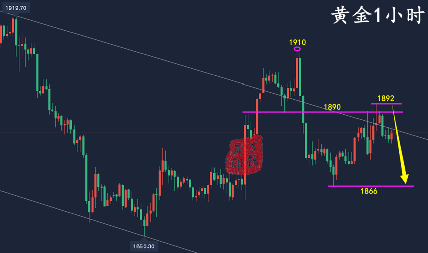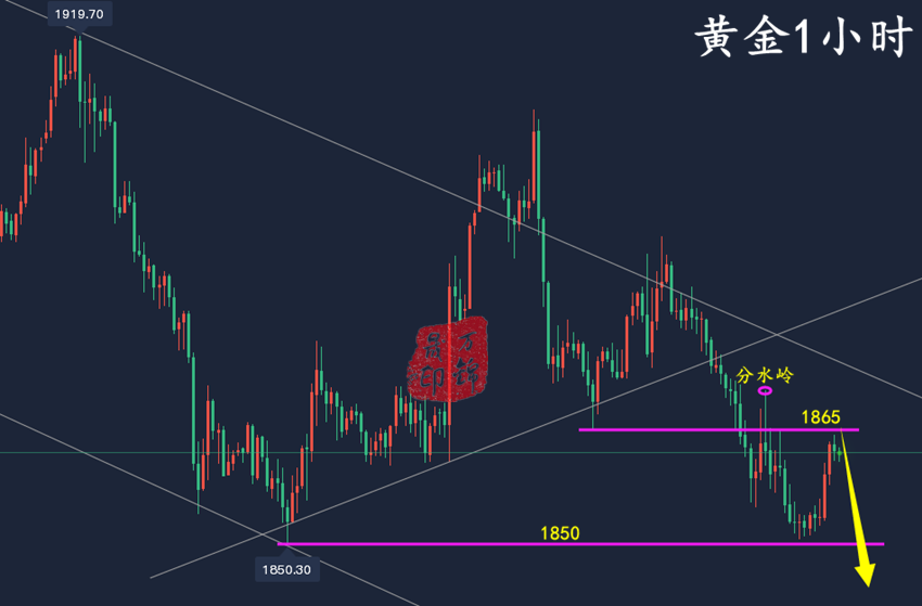 每天最高兴的事,莫过于看到账户盈利;每天最难受的事,莫过于看到账户亏损;这是每个人每天最关心的事。大多数人刚进入市场初生牛犊不怕虎,交易无所畏惧,短暂的盈利沾沾自喜,殊不知终究还是会还回去,吃一堑长一智,对市场要有敬畏之心。交易不光要有进场的勇气,还要有把握行情的谋略,时机很重要,做一个有勇有谋成熟的交易者才能立于不败之地!——万锦晟 黄金方面 今日黄金开盘即跌,小时线碎阴慢跌无反抽,欧盘直接弱势下破周五低点1866一线,跌破1960一线支撑。在周末的分析中锦晟强调过,下破此位置将探底1850前低。对于日内黄金而言,要么直接追空,等反弹就没机会,只能激进做。 晚间黄金顺势空即可,目前没有出现