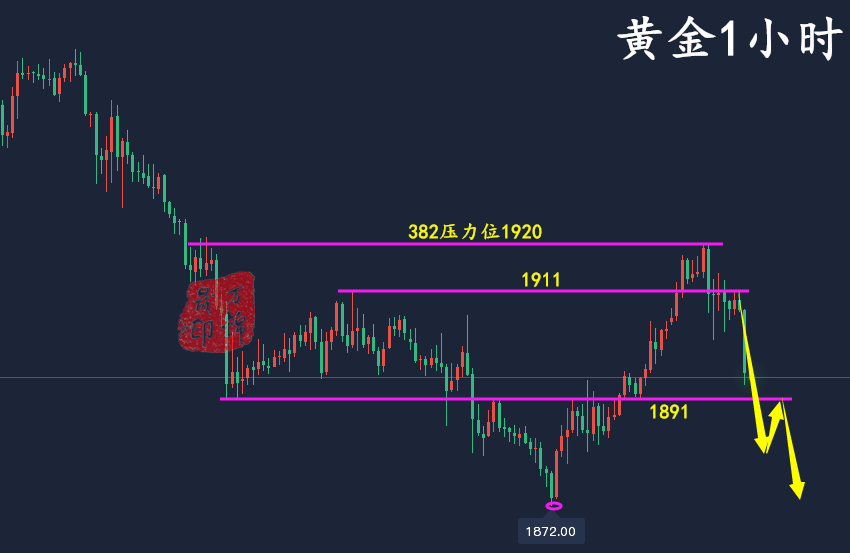 五一劳动节因疫情很多地方都采取限制措施,以往人山人海的旅游场景今年是不会出现了。其实,呆在家里也没什么不好,改变不了环境就改变一下心态,修养身心陪陪家人孩子,也可以趁此机会提升自己。节日不一定非要出游才有仪式感,过好自己的小日子就是最大的仪式感——万锦晟! 黄金方面 上周黄金延续跌势最低触及1872,周五收官日内强势反弹逼近1920,美盘回落凌晨弱势转跌收盘在1900下方,日线长上影线十字K,周线连续大阴。整体来看黄金上方抛压很重,前期日线连阴弱势,反弹力度有限持续性不强,382压力位1920难以形成有效上破,趋势还是空。 当前美指美债双双强势多头,黄金承压空。下周四美联储议息会议,美储主席