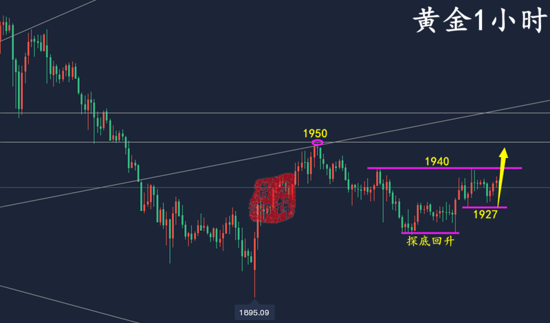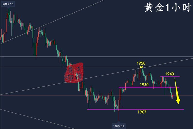 很喜欢一句话“每天叫醒你的不是闹钟,而是责任”!曾经年少无忧无虑,闹钟都闹不醒,如果前一天熬夜,第二天能睡到午后。现在每天叫醒我的是行情,长久以往已经形成了习惯,一大早就自然醒了,即使周末也睡不了太久。 与其说是行情,不如说是责任,信任二字很重,也很珍贵,不能辜负相信我的朋友,这是我的责任!做好每一天的行情,做好每一单,把握当下盈利,不好高骛远,脚踏实地稳健前行!——万锦晟 黄金方面 上周初黄金连阴极弱大跌,周尾借助美储加息探底回升,最低下探1895,而后直接强势反弹至1950压力,周五震荡回落,日线收阴,周K大阴。在之前的分析中锦晟强调过,黄金整体形态头肩顶,大趋势还是处于空头行情中,日线