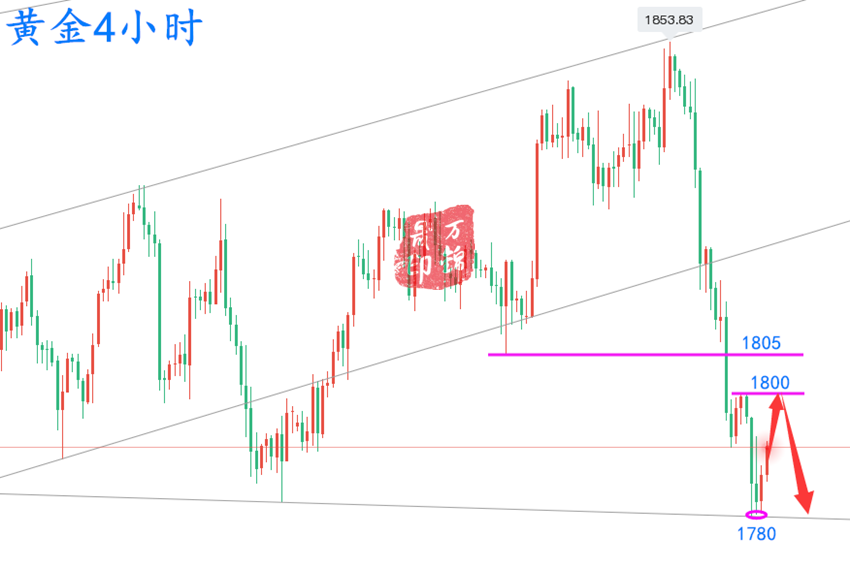 岁月如梭,韶光易逝。不知不觉,今天就是除夕了。回首过去这一年,我们经历过告别和失去,也面临过考验和挑战。 不管曾经有过多少痛苦和心酸,终会看到温暖的阳光。 过去不必提,未来不必慌。 新的一年,新的征程, 愿初心不忘,一往无前,所想能如愿,所盼可实现 ——万锦晟! 黄金方面 黄金上周受美联储会议鹰派讲话影响,美元指数日线连阳大涨破高,黄金承压极弱大跌走单边。从1853最高点跌至1780,跌幅高达73美金,日线三连阴。不仅跌破4小时图通道下轨支撑,也下破日K支撑线,仅剩1780关键支撑,下周重点关注破位情况,一旦破位将打开下方空间,目标直指1760—1752! 周一适逢大年三十,也是本月最后一个