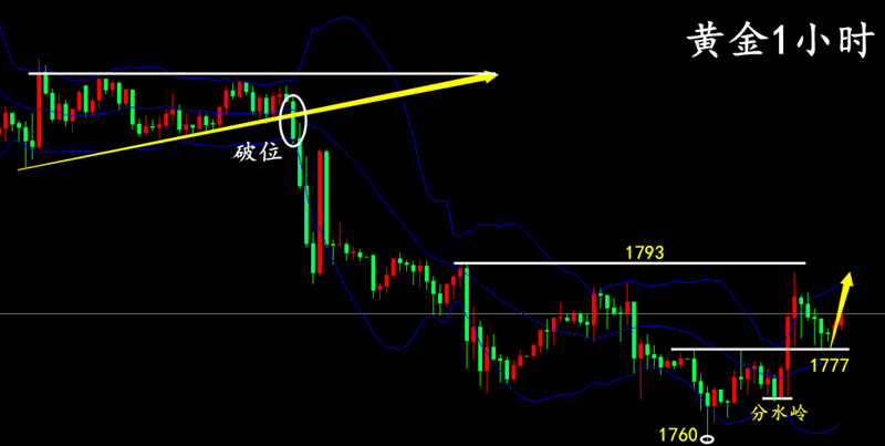 风险第一,盈利第二;保住本金,再求利润——万锦晟分析师! 黄金凌晨横盘,早间开盘续跌,小时线连阴,测试昨日低点,结合目前大的空头趋势,先看续跌破低。早间黄金刺破前底1763一线,关键看能否形成双底支撑,今日周五黄金周线收官容易发生变盘。 对于日内黄金,暂时先看续跌,反弹不能超过开跌口1777,上去了看震荡。另外欧盘一定要走续跌破低;顶底转换1770附近;按照跌幅看,618的位置也在1770附近。操作上激进者:1770附近进空,目标看1756-1760;稳健者:1777附近空。若欧盘破低,美盘反抽继续空即可。 黄金单边下跌,有人欢喜有人愁,我们的交易比较顺利!顺势而为一路空下来,昨日我们一共操