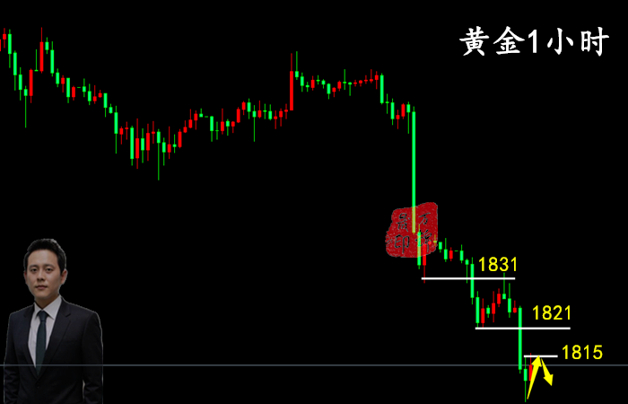 黄金昨日破位大跌后,今日早盘黄金延续下跌,破低1831一线,最低到达1821后反弹。早间黄金空单获利7美金后,按照我们的布局,欧盘反弹1831附近再次进空,行情也给到我们预先分析的进场点位,最终在美盘前于1817止盈离场,获利14美金。 那么欧盘破底,那就意味着美盘还有空。价格在跌穿昨日低点之后,极弱下跌并且跌幅大,反弹几乎没有出现。所以晚间美盘需要借助反弹再来空一次。早盘低点1821,顶底转换晚间的压力位,但是位置较高,不一定能到。所以关注另外一个位置1815—1813一线,也是最后一根大阴线的顶部,触及空,目标看1805—1800。 周一(11.23)黄金收获37美金! 黄金大行情好行情