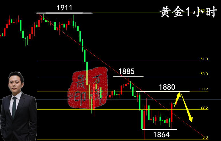 不管昨日如何,今日坦然面对,作为一个合格的交易者要学会清零。投资交易永远都需要一个清醒的头脑,从行情、趋势、心态、技巧等方面综合考虑,很多时候你缺的并不是盈利机会,而是缺一个好老师来分析指导,当局者迷旁观者清。 我尽量以通俗易懂,深入浅出的方式给大家分析最新的行情走势,希望我的博文能给你带来帮助。让你少走点弯路,少点亏损,多点盈利。震荡多日的黄金昨日迎来40美金的大跌,日线最终收大阴,触底1869后在凌晨小幅反弹。 凌晨反弹的高点刚好在0.382的位置1884一线,而早间黄金小幅探底回升,延续凌晨反弹趋势,所以欧盘重点关注凌晨高点的压制位1884—1885,触及空,目标看1874—1869;