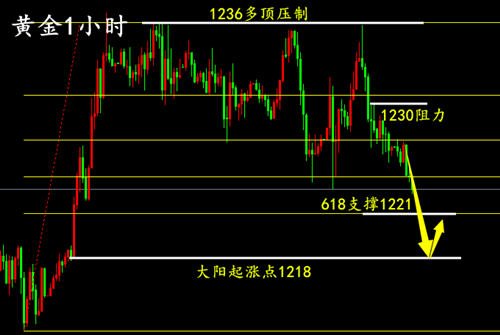 季节是你无法阻挡的,和时间的流逝一样,早上起不起床,太阳都会准点升起。交易也是如此,行情的波动涨跌即便是未知的,但波动与你的交易,都存在的事实。有些时候,我们总是听到许多的抱怨:说行情如何如何,自己如何如何。我需要告诉你,抱怨行情没有意义,责怪自己的过去,也没有意义,第二日行情还是照样运行,根除的办法在于我们本身,这才会有减少抱怨的资本。如果你改变不了行情,那么最好的办法,是改变自己。 周四(11.8)黄金走势分析及操作策略! 周三,黄金再次欧盘上升,测试前期高点1236,美盘循环周二形态,出现连续下跌,日线报收于四连阴,这也是当前反抽以来,阴线数量最多的一次,但下跌的力度并不是很大。 空间
