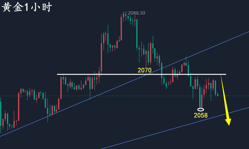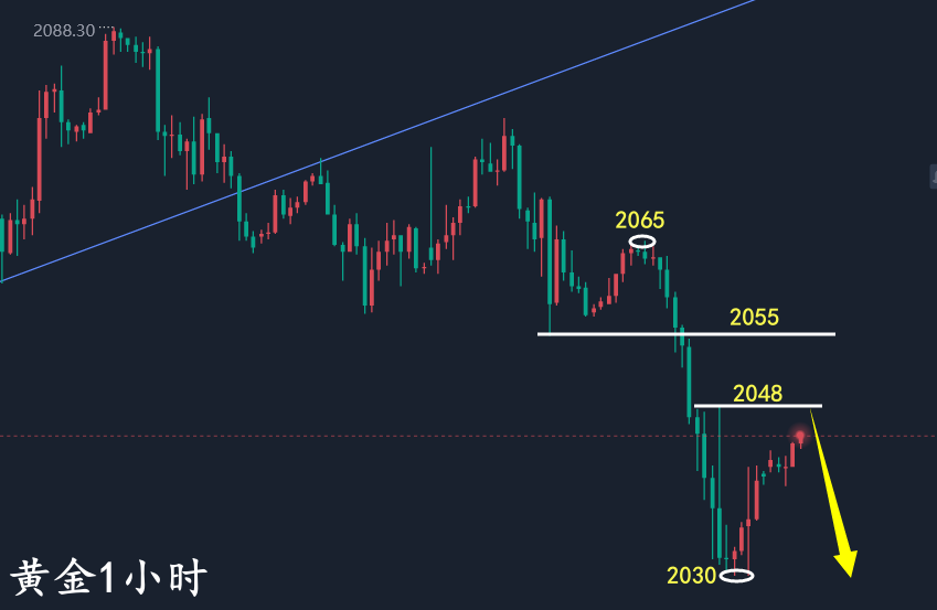 2024年第一个月第一周黄金就走了下跌,日线三连阴之后昨日放量大跌,大阴收盘回踩30日均线支撑,背离空的信号更加明确,走势符合黄金周线和月线图上回落空的信号。整体大趋势虽然是多,但是短线空头趋势明确,或将进一步下探至2015—2009支撑位。至于说跌破2000关口,我个人认为可能性不大。 还是强调一点,目前的下跌不要认为是大趋势转空,只能当成多头回落修正。在2024年美储降息的大背景之下美指进入下行周期,美指的短期反弹难以形成趋势性多头行情,未来还要走弱。所以,黄金一旦调整结束还将开启二次上升。 短线方面,黄金昨日早间碎阳反弹,午后在2065开启连阴下跌,欧美盘走了极弱行情无反弹,凌晨止跌于