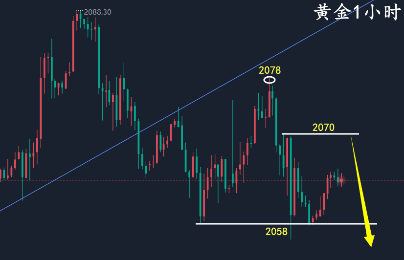 上周在圣诞和元旦双节之间,黄金市场走势并不清淡,还是有意外的惊喜。周初震荡洗盘式上升,逐步走强慢涨逼空,但是行情爆发多发生在凌晨。最后周尾冲高回落,最高到达2088一线,触及上方趋势线压力走跌,周五美盘一度下探测试2060一线支撑,但是凌晨反弹力度有限,最后低位收盘在2062,日线双阴回落。 同时,小时线上呈阶梯式下跌,短期趋势线支撑破位,意味着当前黄金阶段性见顶。而周K收倒锤线说明上方有较强压力,三阳一阴循环下周黄金看空即可,下周周线收阴的概率很大。日线经过上周的酝酿,顶背离信号愈加明显,压制在趋势线下方还有进一步下跌,至少可以看到短期均线2047—2048,也是前期顶底转换位。 但需注意