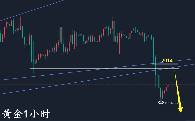 任何交易和分析其实都有惯性思维在里面,涨了认为还能涨更高,跌了就认为还能跌更多,惯性思维保持的时间或长或短。往往认为自己是对的,这是因为每个人心中或者说潜意识都有一个执念,顺势不错但要有风险意识。要放下执念,好好规划;调整思路,什么是现实,什么是理想,加油! 黄金上周迎来大跌,从周一刷新高2144以来连续跌了一个星期,周三周四虽然止跌转阳,但是反弹力度不及预期,周五在大非农和失业率双双利空影响下,一度跌破2000关口,最低触及1994,最后收盘在2004一线。 顶底转换位2009大阴下破,那么2000关口就很难保住,虽然是影线刺破,但是凌晨反弹幅度有限,日线连阴跌破短期均线,下周初先看延续。