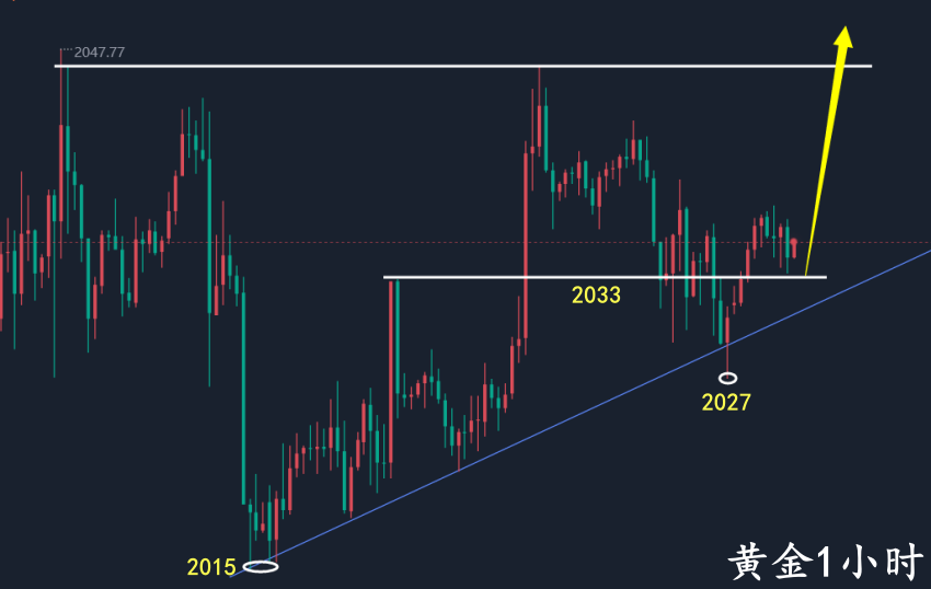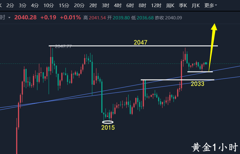 黄金这两日的走势和锦晟周末预期基本吻合,周五在美储相关人员讲话中虽然出现较大回落,但对于整体多头趋势影响有限,日K单阴回踩短期均线支撑,这两日连续收阳,昨日美盘价格再度冲击2047高点,虽然未能上破,但是收线在高位,今日还是要延续看多。 消息面和数据对行情确实有一定影响,但也要判别其重要性,不能简单的以数据利多利空就决定行情涨跌,因此不要盲目的去追涨杀跌,那样只会永远跟在行情后面跑,没有任何意义。所有的交易和市场情绪都会反应在K线上,裸K才是永远的经典,最能体现多空能量关系和转换时间,技术指标只是辅助,滞后性很强,所以要综合多方面因素整体考虑分析。 今日黄金早间走了小幅回调修正,触及2036