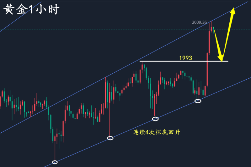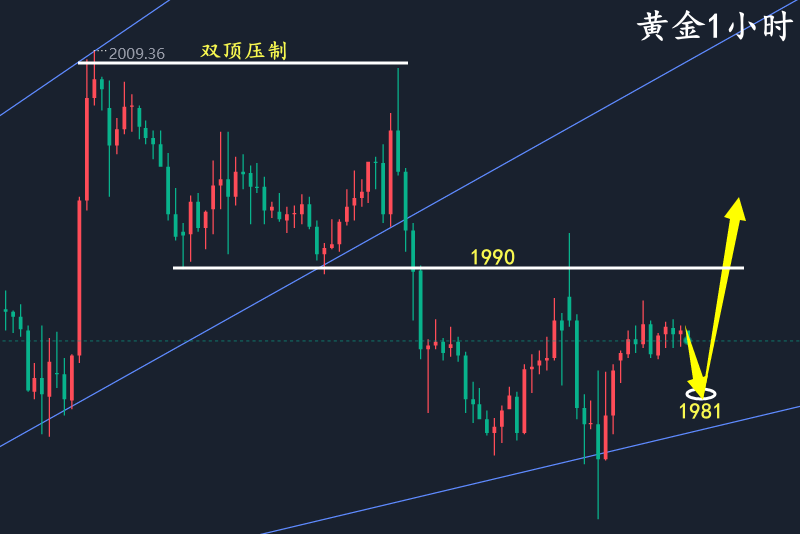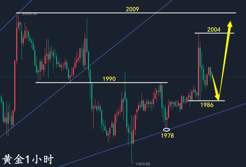 黄金周五刚刚大阳站上2000关口,周一就偃旗息鼓走了震荡横盘,这是连续第三周周一低开。昨日日内碎阳慢涨节奏保持不错,但美盘还是压制在2009高点下方走了冲高回落,凌晨扩大跌幅一度触及1980起涨点,日线形成双阴回撤,整体而言行情是否转空仍需进一步观察。 这一轮上升从1810—2009涨幅将近200美金,2000关口是一个槛,趋势虽然还是多,但涨势肯定会减弱,波段涨幅也没有那么大。局势没有新的变化之前,技术面有回撤有调整是正常的,不要一跌就认为是转空,一涨就觉得要飞天,理性看待不要盲目追涨杀跌,在前期极强行情中追可能也不会亏,甚至还有盈利,现在肯定不合适。 目前来看周线三根大阳有回调修正的需求