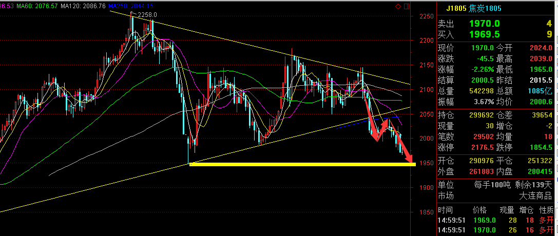 焦煤1805行情突破三角形震荡之后,今日回到三角形震荡区间,那么需要关注回踩下方支撑60/120均线,点位在1345左右,另外需要关注三角形下沿趋势线1330的支撑。 焦炭目前压制于2050一线,白天给了2035空单建议也是保本出局,短线来看,只要没有再站上2050继续测试下跌趋势线,短期还有望继续下探,下方支撑2010-1985.