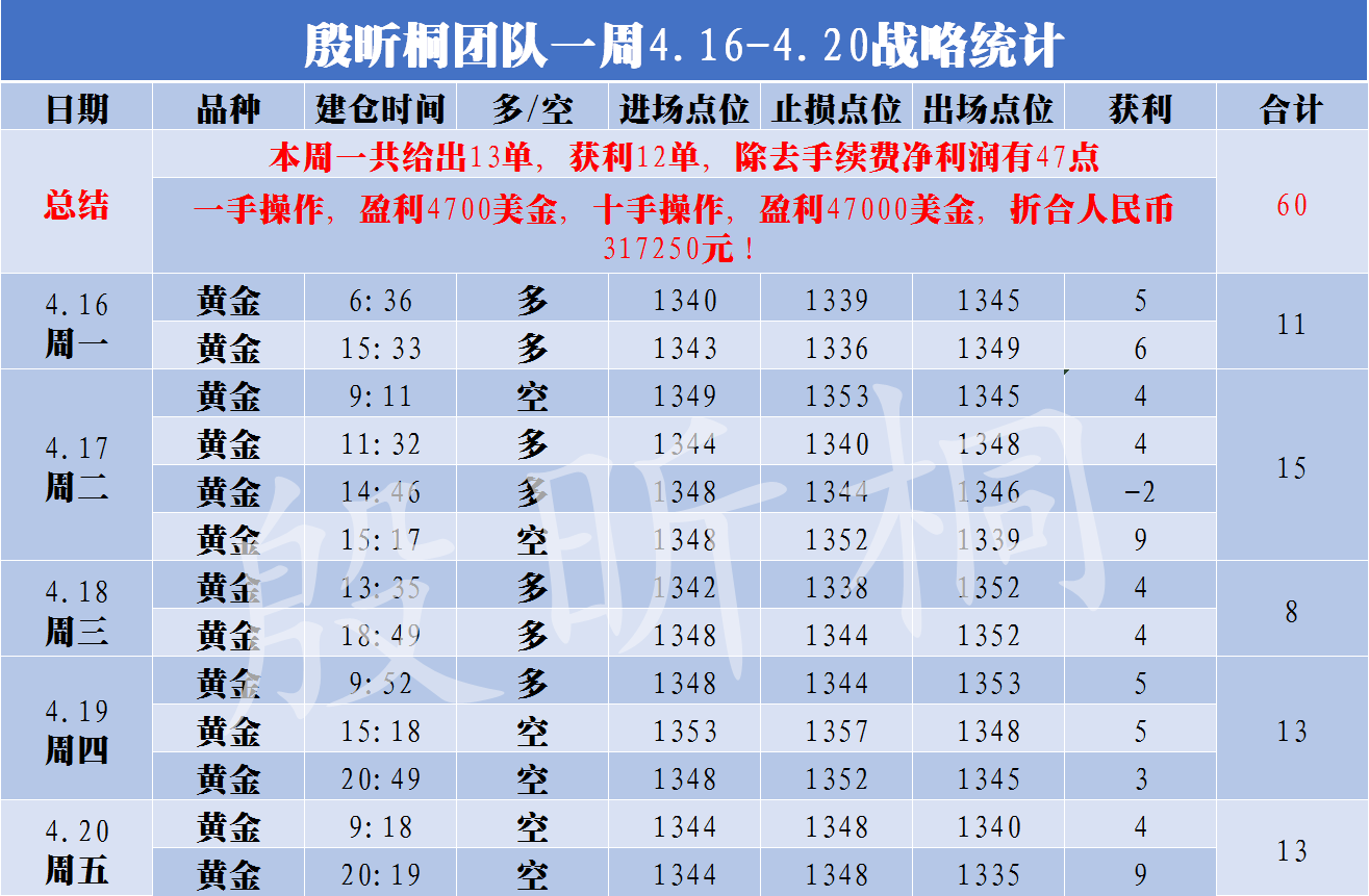 殷昕桐:4.19生于忧患死于安乐,黄金日内逢低做多! 胜固欣然,败也从容。在这个高风险高收益市场,一定是需要专业的分析团队做好风控,依靠专业的技术为你保驾护航,我是殷昕桐,因为从容所以稳定,因为稳定才是极致。如果没有一套完整的交易系统,一份稳重的心态,要想在现货市场长期稳定的盈利,真的是很难、很难。难在我