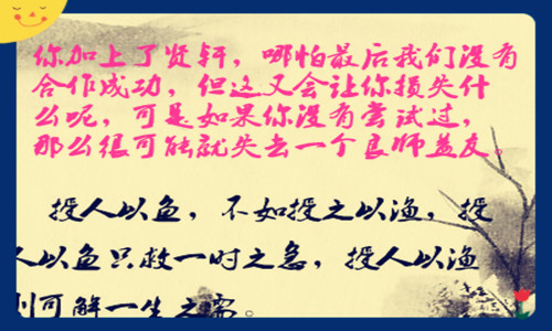 授人以鱼不如授人以渔这句话是出自淮南子说林训的一句千古名言,也是贤轩经常说的一句话,鱼是最终的目的,而渔是获得鱼的一种手段,所以这句话的意思就是一条鱼虽然能解决我们的一时之需,却不能解决我们的长久之需,如果想要永久有鱼吃那么还是得去学会钓鱼的方法。其实这么浅显的道理相信大家都能懂,但是真正去做的又有