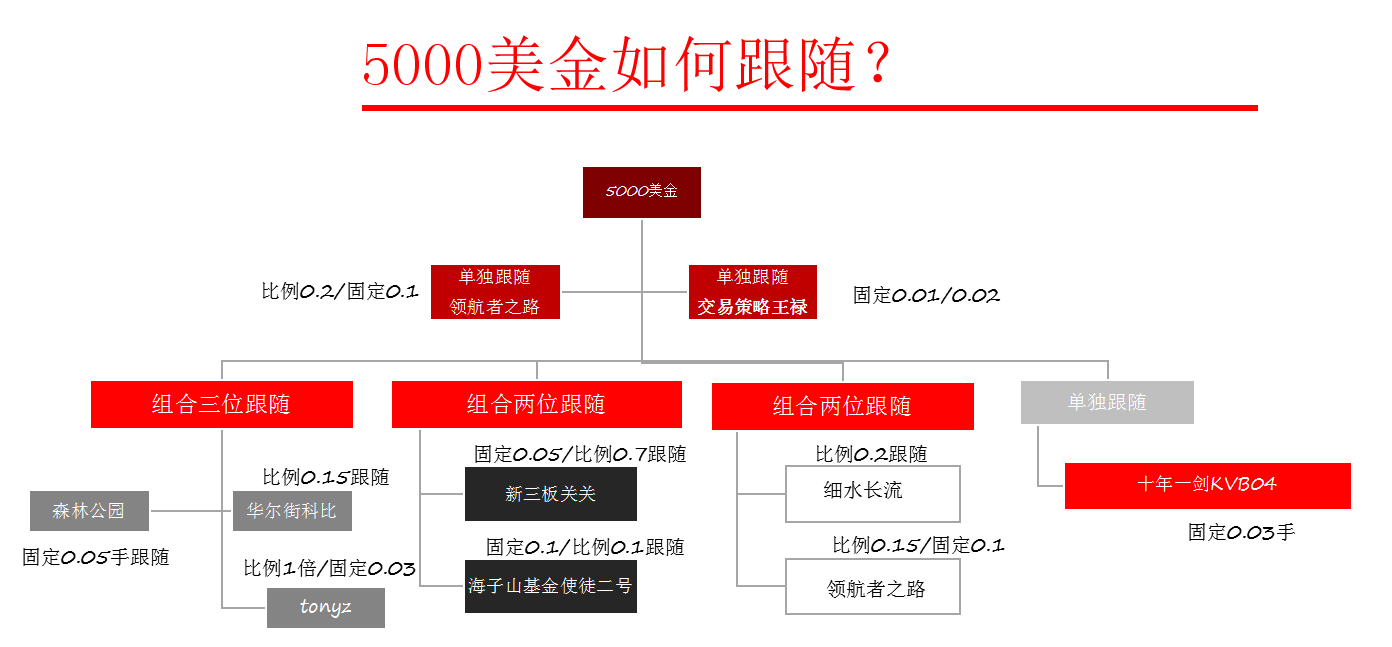 一.人物介绍 1.海子山基金你使徒二号 大赛盈利榜第一+月冠军,持赢能力者,中长线趋势交易,仓位30%内 2.日积月累的盈利 大赛冠军,波段交易,轻仓短线为主,美盘较为活跃,仓位15%-30%区间 3.反之道 交易是一门艺术!严格止损,连亏3单休整,偏好4小时级别,仓位10%左右 二.风控设置 1.对于10000美金跟随者,建议最大持