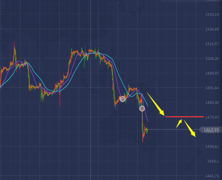 黄金因为周线在上周巨阴收盘之后,一阴吞三阳,这就定义了我们在本周一定是高空黄金的,只是在日线方面有望走出两阴一阳的小型循环,而同时周五的凌晨是探底回升,所以昨日是先涨后跌。技术面上主趋势下行,那么你在判断支撑位的时候一定记住,触及支撑位反抽的力度代表他的支撑性,如果说价格在支撑位附近横盘或者说触及之后不反弹,那么这个位置一定是没有支撑性的,下破的概率就很高。支撑位的位置是不能连续性测试的,如果连续性测试就意味着不能去做多,而且下破的概率很高。昨日在1460的一线,日内没有给到,晚间给到就不能做,所有的交易,不过,我们补充一点,就是弱势当中一旦破掉前期的低点向下延生的概率就很高,所以昨日在破掉